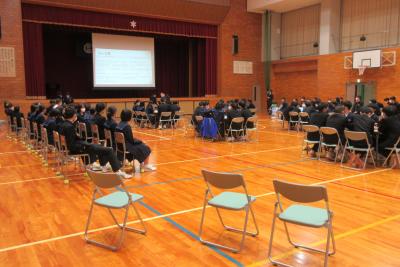 川北中学校でレベルアップ川北会議が開催され、6年生の代表者が直接、ほかの6年生は教室でリモート参加しました。メディアとの付き合い方について、川北町4小中学校で話し合いをしました。