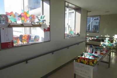 2階の渡り廊下に、3年生と5年生の図工の作品を展示しています。ちょっとした作品展のようで、とてもきれいです。