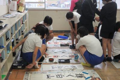 今年も山本先生に、書初めの指導をお願いしました。今日は3年生と6年生でした。集まって、じっくり話を聞いています。