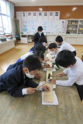 一列になって、くぎを打つ練習をしています。完成すると、ビー玉を転がすゲームになるはずです。