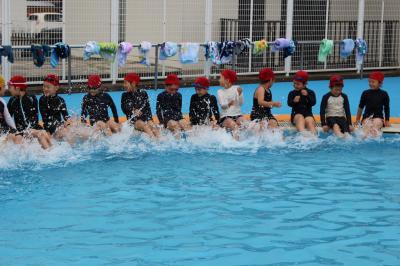 今日は、1年生が初めてプールに入りました。