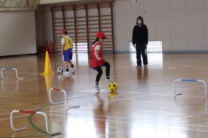 準備運動を兼ねて、1人1個のサッカーボールで、ミニハードルをよけながら、けっています。