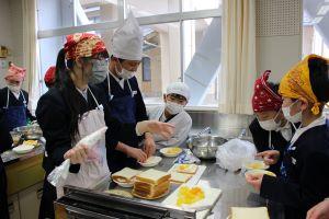 グループで協力しながら、手際よく食パンにクリームを塗ったり、フルーツを並べて挟んでいる最中でした。