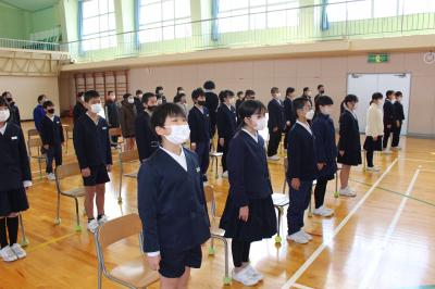 次に、生徒指導の先生から、春休み中の生活についてのお話がありました。1年間がんばって成長してきたことを、次の学年につなげられるように規則正しい生活をしてほしいと伝えていました。
