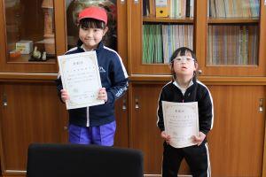 その後、1年間あいさつがすばらしかった子を「あいさつ名人」として表彰しました。そして、自学を1年間がんばって5冊以上終わらせた子も表彰しました。その代表として、5年生の子が表彰状を校長先生からいただきました。