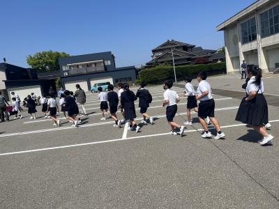 給食室からの出火を想定し、体育館駐車場に避難する訓練です。子どもたちは、「おさない はしらない しゃべらない