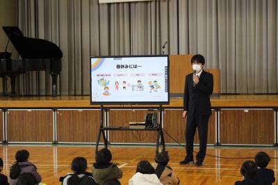 次に、生徒指導の先生から、春休み中の生活についてのお話がありました。1年間がんばって成長してきたことを、次の学年につなげられるように規則正しい生活をしてほしいと伝えていました。