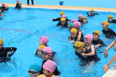 次に、プールサイドに行き、足から順番に水をかけました。そして、足をバシャバシャした後、いよいよプールに入りました。6年生のお兄さん・お姉さんが励ましながら横にいてくれたので、全員プールに入ることができました。