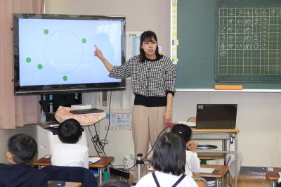 今日、川北保育所の所長さんと、昨年度担任をされていた保育士さんが保小連絡会で1年生の授業を見に来てくださいました。