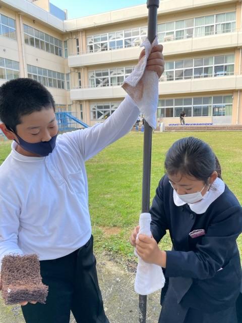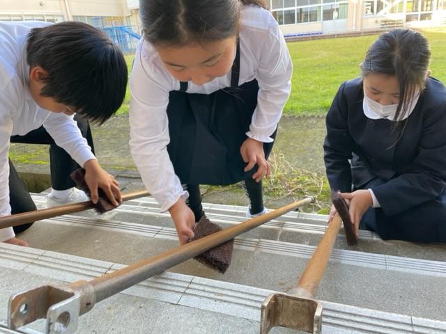 月曜日の委員会で鉄棒を設置しました。高学年の子どもたちが、サビた鉄棒をキレイにしてくれました*'︶'*)ノ"