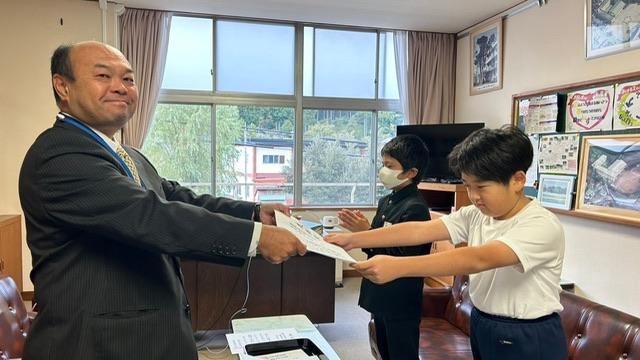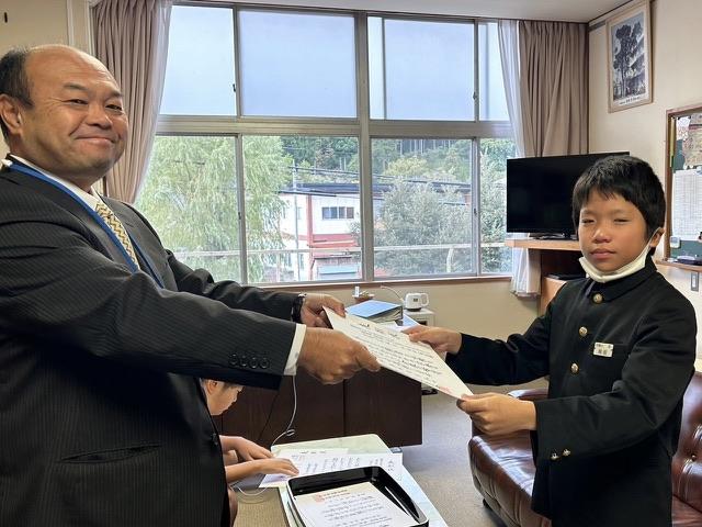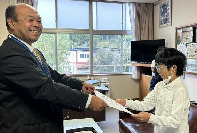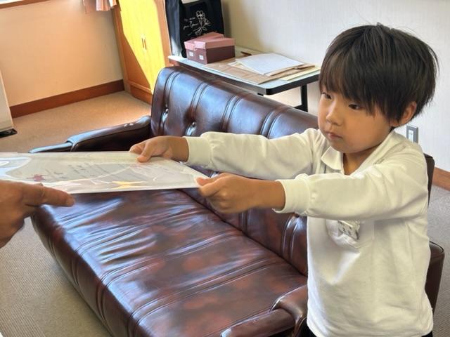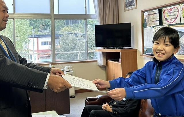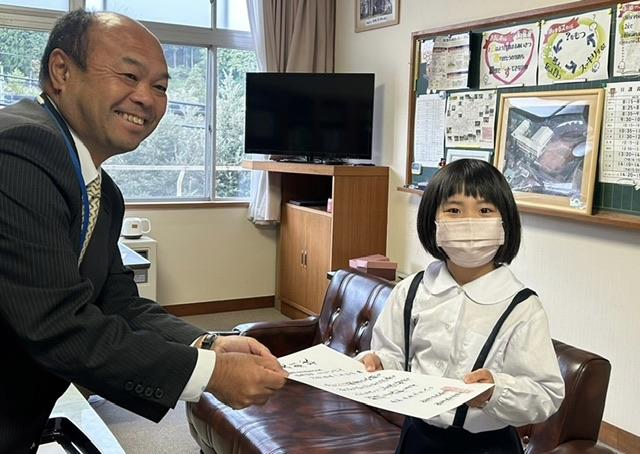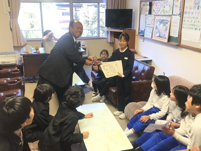 科学作品コンクールの表彰状が届き、校長先生から渡されました。