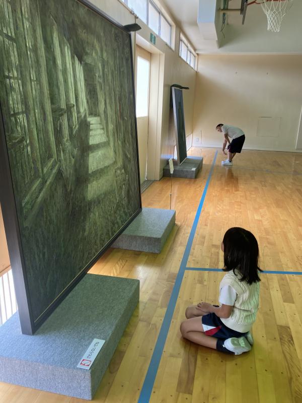 13点の作品がずらっと並んだ体育館は、まるでアートギャラリーのよう。美術館に行ったことのない子も多く、入口で「わあ~」とため息を漏らす子どもたち。