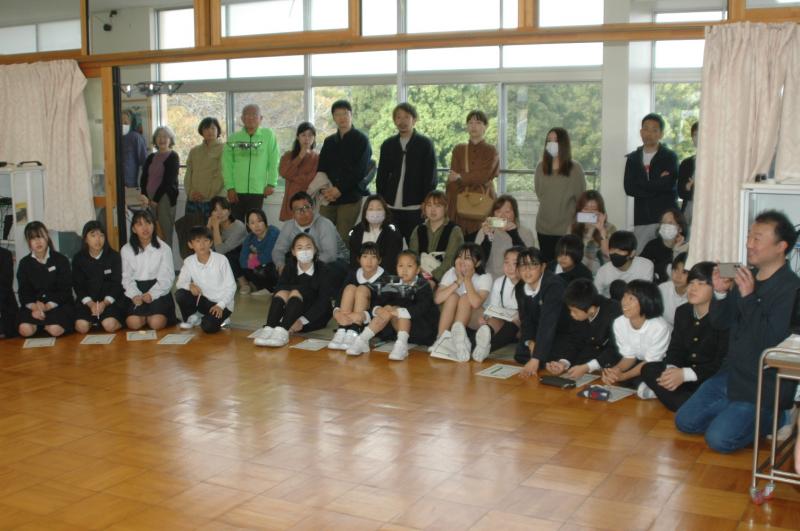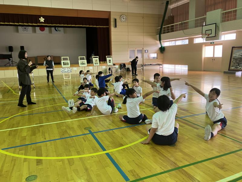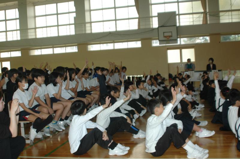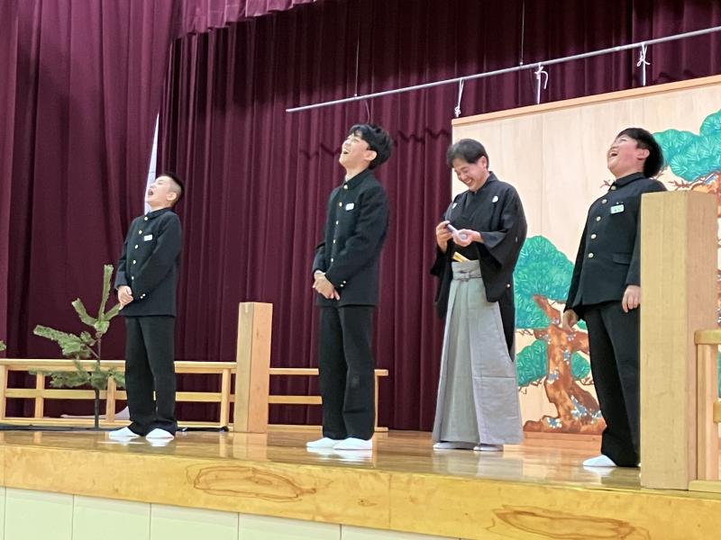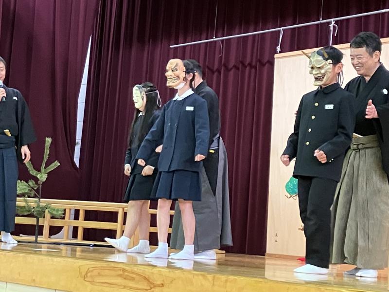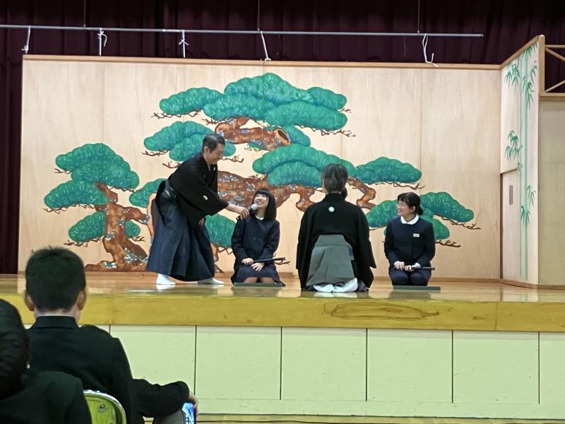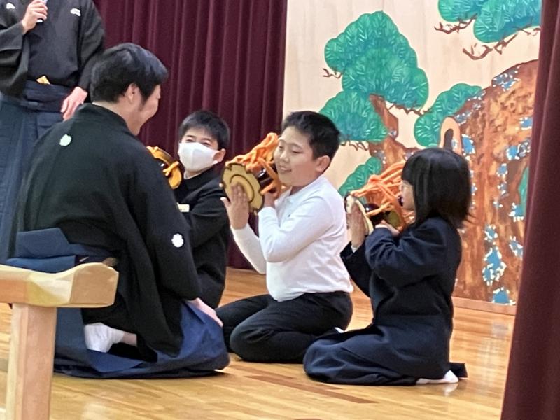 金沢能楽会の能楽師さん15名をお招きして「県民移動能」が行われ、4・5・6年児童が参加しました。