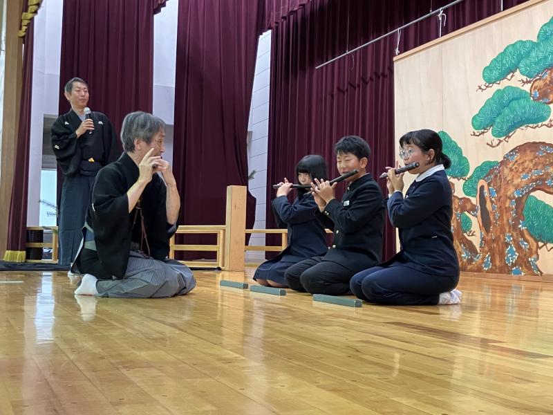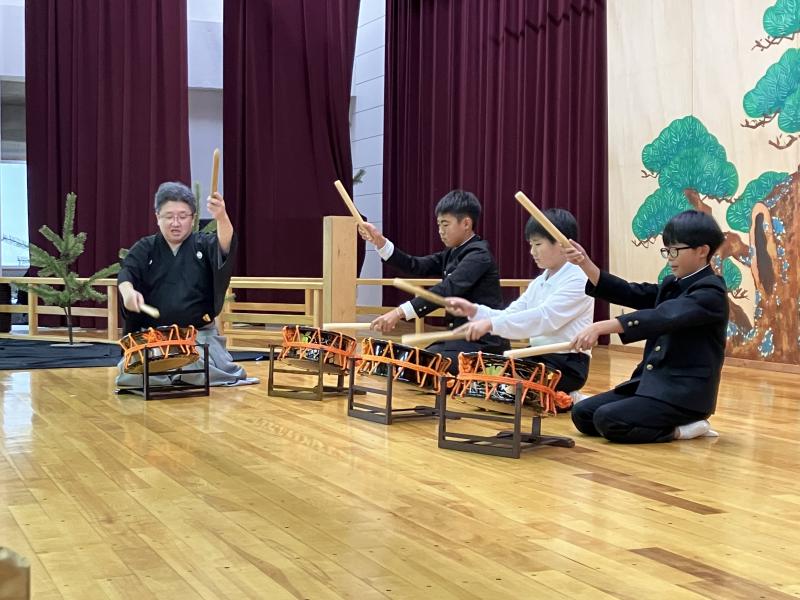 能楽師さんによる能「井筒」や狂言「柿山伏」を鑑賞し、代表の児童が実際に楽器や舞などを体験させていただきました。