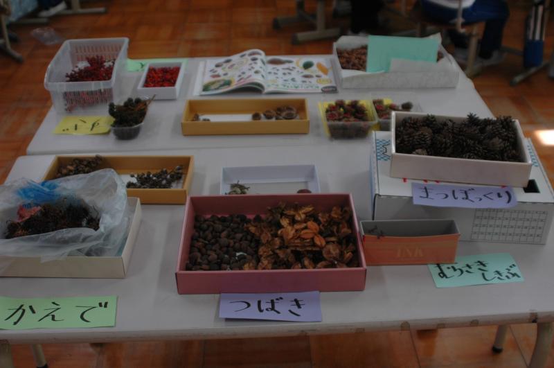 1年生が、どんぐりや松ぼっくりなど、秋のものを使って色々なおもちゃを作りました!