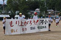 今年のテーマは「もりあがろう!河小 楽しく 全力 団結 やってよかった」でした。このテーマ通り、皆、全力で競技に演技に頑張りました。