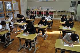 その後は、教室に戻って毎年恒例の書初め大会を行いました。どの子も、冬休み中の練習の成果を発揮しようと真剣に取り組みました。明日から、13日金曜日お昼まで学校公開です。作品は、教室内や教室横廊下に掲示してありますので是非お越しいただきご覧ください。