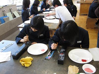 今年度6年生は、卒業を前にして、自分たちの卒業証書を入れる箱に蒔絵をしました。地域に住む蒔絵をお仕事にしていらっしゃる方々4人に来ていただき、ご指導いただきました。自分の考えた図案を真剣にかきました。世界に1つだけの卒業証書入れができあがり、子どもたちは皆大満足でした。一生の宝物にしてほしいと思います。
