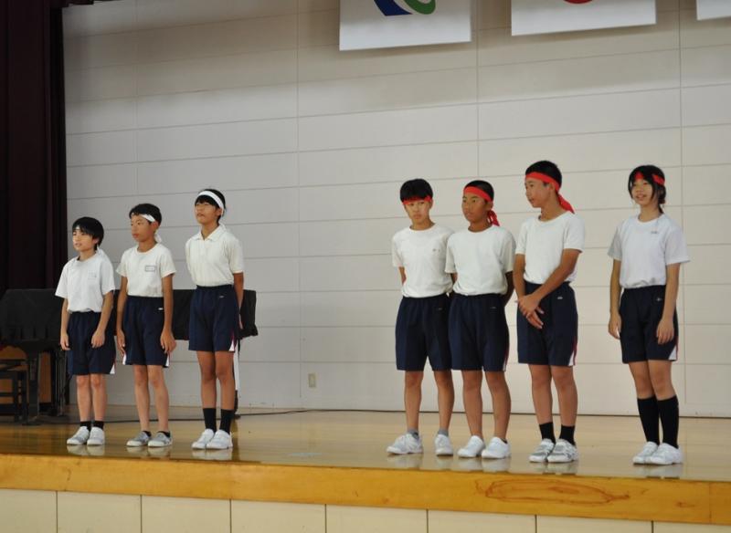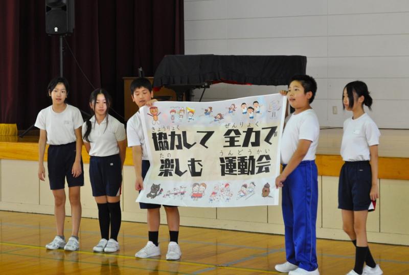 9月27日の運動会にむけて、今年度のスローガンが運営委員会より発表されました!そして赤団白団の団長・副団長が気合の一言を!