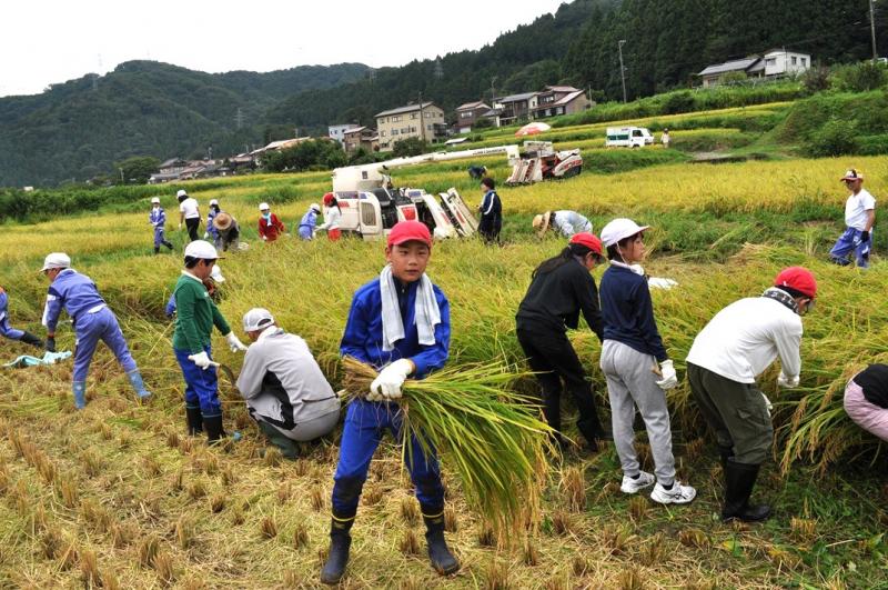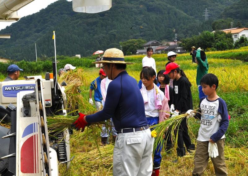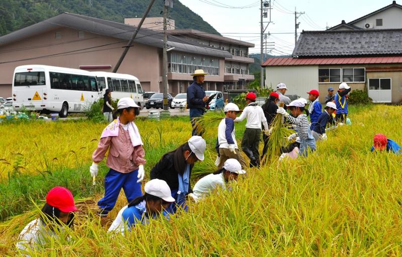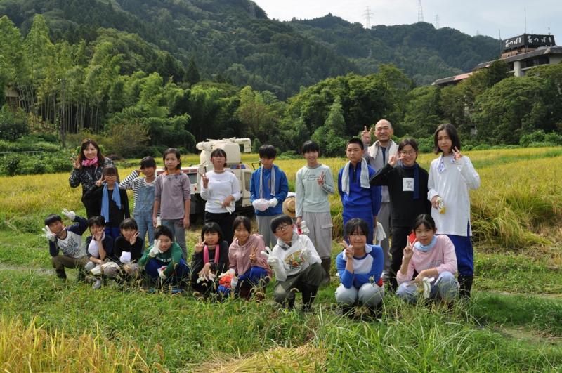 9月10日 お天気が心配でしたが、午前中は晴れるという天気予報を信じて稲刈りを行いました。山中小と河南小との合同稲刈り(今年で4回目)みんなで暑い中、頑張りました。農家の方の苦労や機械化の便利さなどいろいろと体験して感じることがあったようです。秋の収穫祭も楽しみですね!若美谷営農の皆様ありがとうございました!