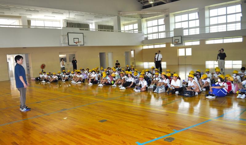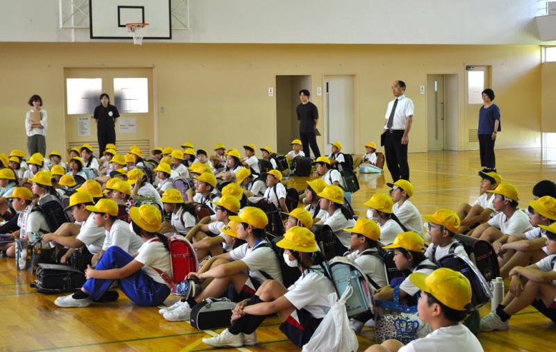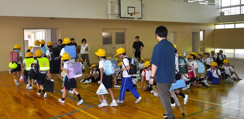7月16日(水)各町ごとに分かれて集団登校や個別登校の確認・下校指導、自転車の乗り方、挨拶についての振り返り 夏休みの行事・危険個所等についての確認を行いました。体育館に集まり、先生の話を聞いて元気に「さようなら~」集団下校で帰りました。