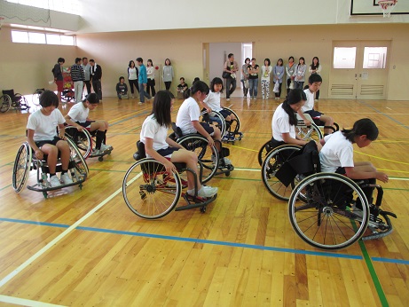本日、白山市の岩崎大輔さんと才田隆史さんに保護者も子どもも対象にお話と車いすバスケットの体験をさせていただきました。
