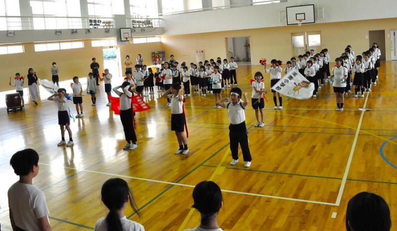 5年生が中心となって「全校で協力して、6年生が最後までがんばれる応援をしよう」という目当てを立てて取り組みました。