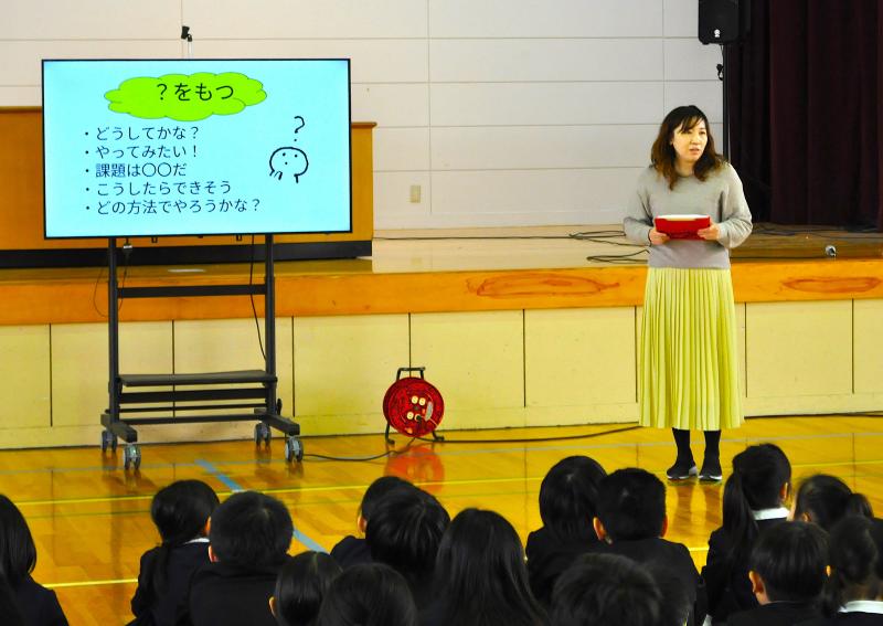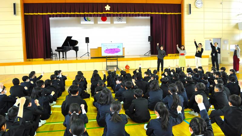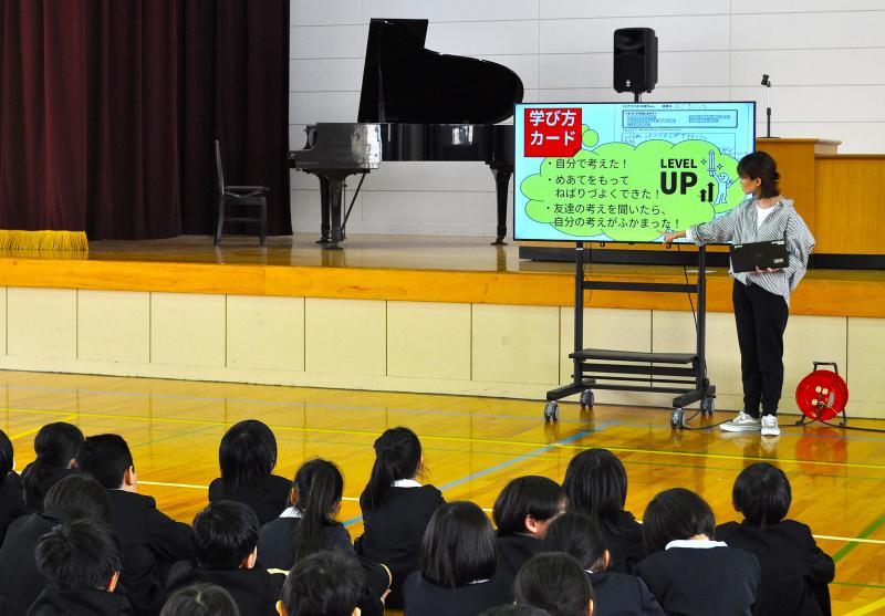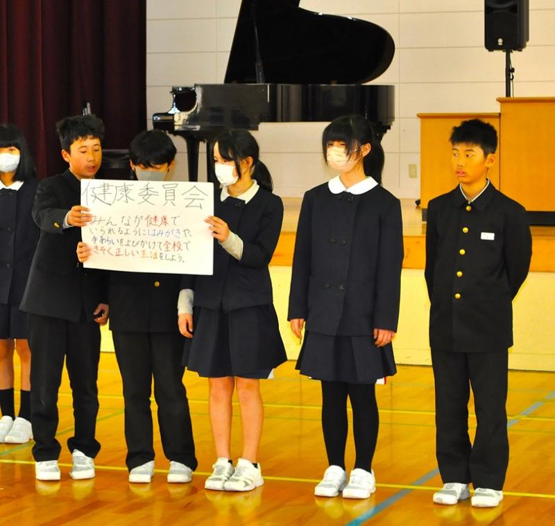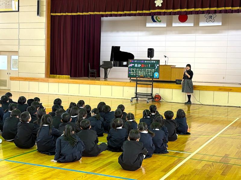 全校集会で各学年の代表が、各クラスの取り組みと振り返りを話してくれました!1年生も初めての集会で一生懸命思いを伝えることができました!