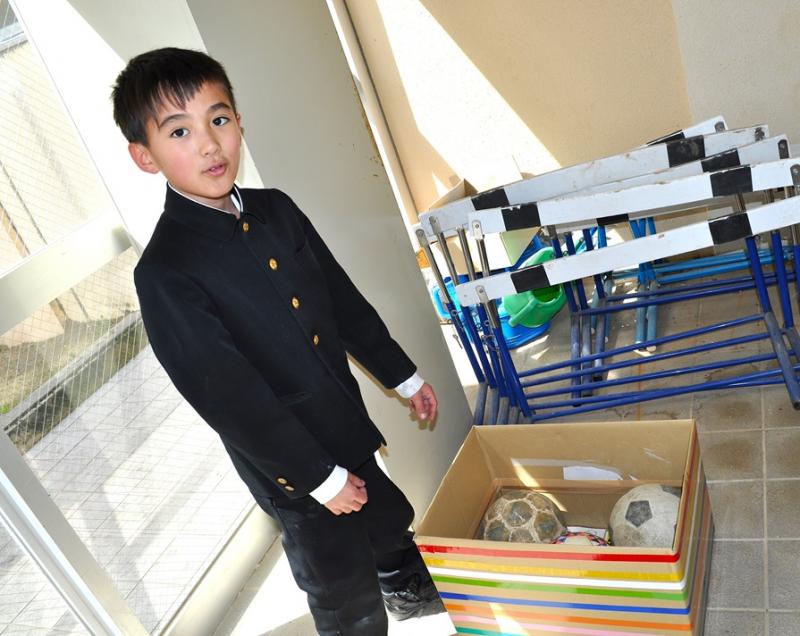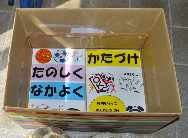 サッカーボール入れは手作り…「校長先生作ったん?」「うん!どうかな?」「いい感じ!」