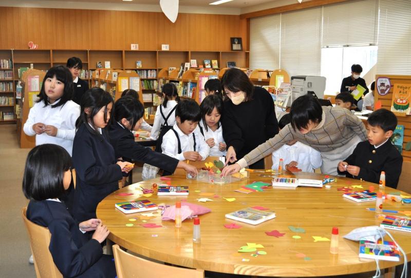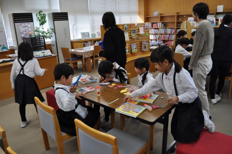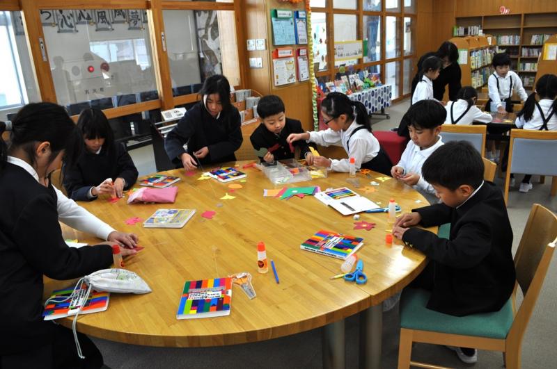 子ども達がはさみやクーピーをもって嬉しそうに図書室へ