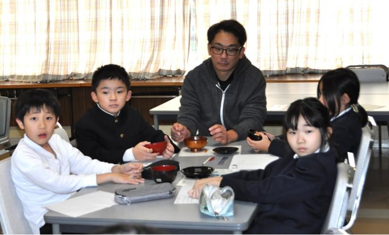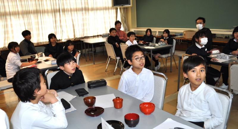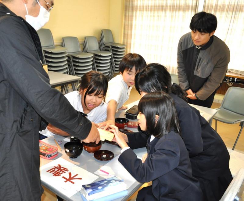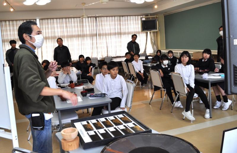 11月13日に山中漆器連合組合の方々に来ていただき、加賀市の伝統文化である山中漆器について4年生が学びました。