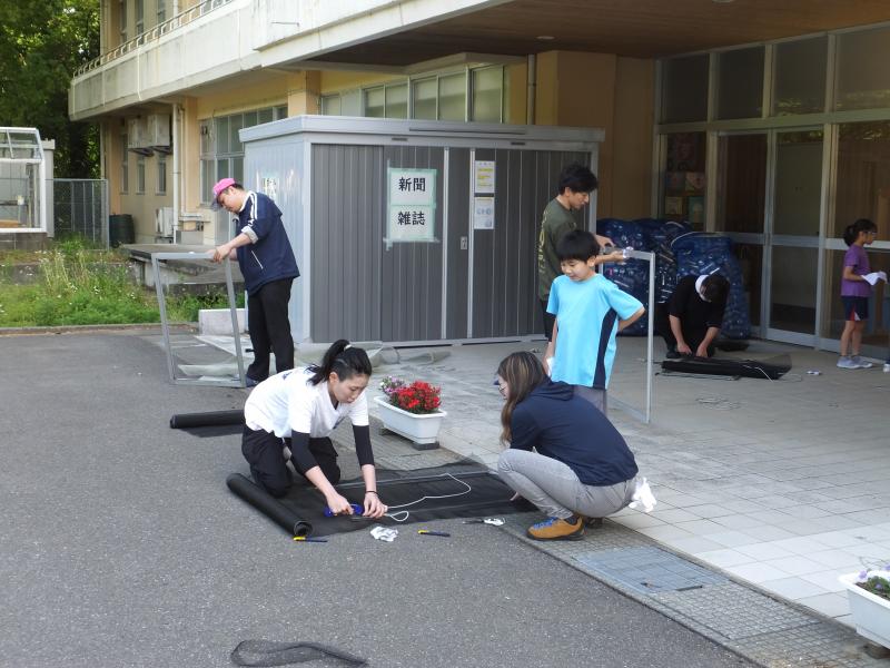 網戸の張替えもしていただき助かりました。次は教職員でプールの中の掃除ですね。おたまじゃくしとカエルのたまごとの闘い!がんばって子ども達のためにきれいにします!最終仕上げは高学年の子ども達と!プール開きが楽しみですね。