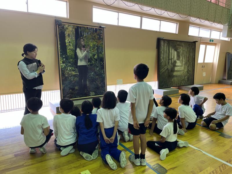 13点の作品がずらっと並んだ体育館は、まるでアートギャラリーのよう。美術館に行ったことのない子も多く、入口で「わあ~」とため息を漏らす子どもたち。
