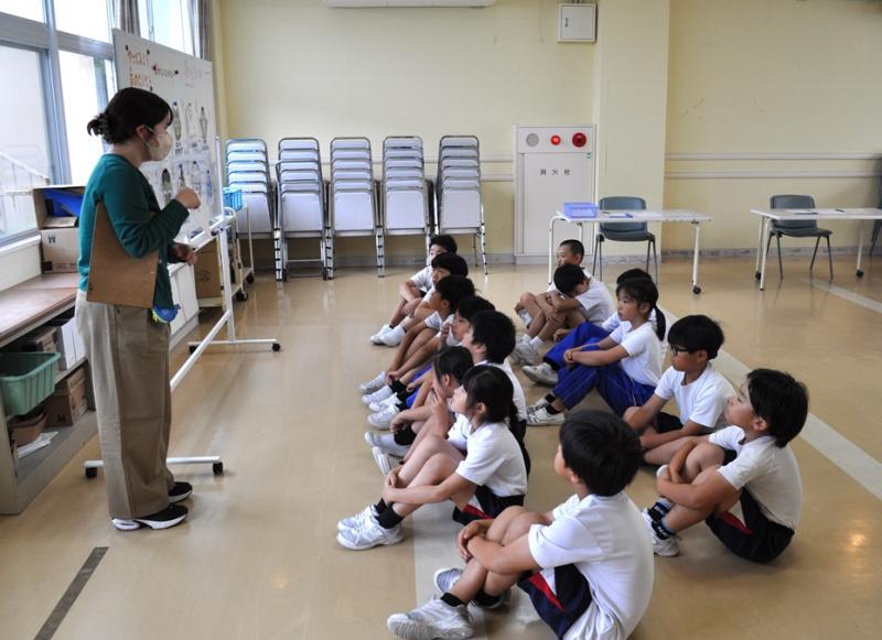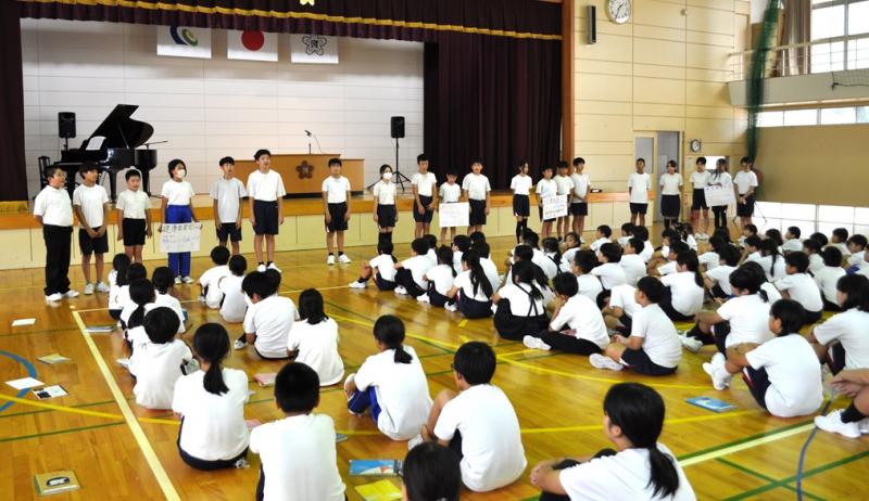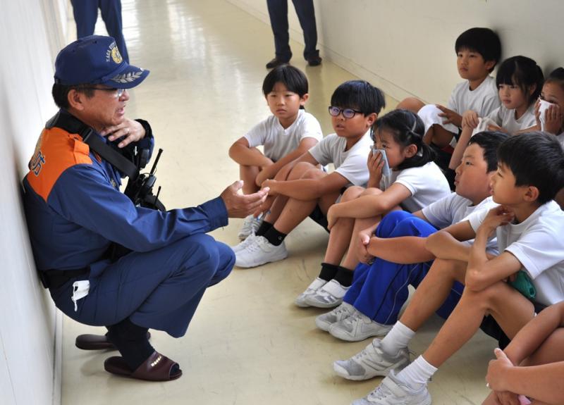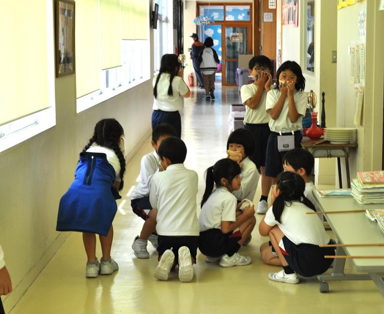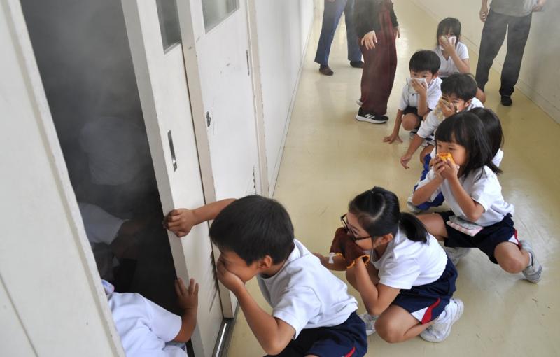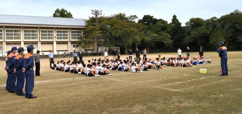 今回は休み時間に火災が起きてしまった場合の訓練…。みんな、しっかり放送を聞いて避難できました。そのあと、全校で煙体験を行いました。暗い中、どのように避難すればいいか実際にやってみました。しっかり消防士の方のお話も聞けましたね。「自分の命は自分で守る」とってもいい訓練ができました。