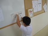算数の問題を掲示し、子どもたちが解答できるよう用紙も準備されています。早速、チャレンジしている子がいました。多くの子に挑戦してほしいものです。