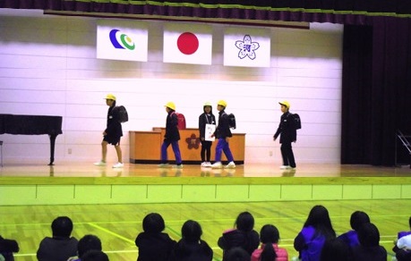 児童会の運営委員の児童たちが「あいさつ運動」の呼びかけをわかりやすく劇のように演じながらしてくれました。