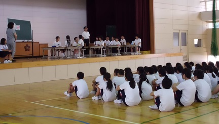 2学期が始まりました。1学期のことをふりかえって全校で「めざす授業」について勉強しました。4年生が体育館のステージで、「こんな授業をめざそう」という見本をしめしてくれました。そのあと全校で以下のように確認しました。