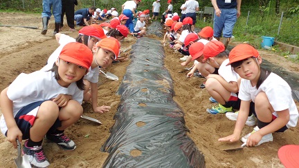 今日1,2年生がJAの方に助けていただいて「さつまいも」を植えました。雑草が生えないように、マルチシートを敷きました。水をたっぷりまいたあとにマルチシートを敷きました。秋においしいさつまいもが採れるのが楽しみですね。