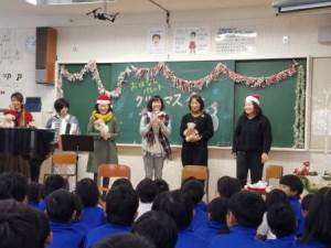 12月14日(木)に、お話パレットさんによる、「クリスマス読み聞かせの会」が開かれました。本の読み聞かせの前後に演奏や歌があり、昼休みの短い時間ではありましたが、素晴らしいひとときを過ごすことが出来ました。演奏や歌が始まると、びっくりしてきょろきょろと周りを見渡す子ども達の様子を見て、改めてパレットさんの芸達者ぶりに感動しました。最後には一人一人に手作りのブックマークが贈られ、子ども達もとっても喜んでいました。本当にありがとうございました。