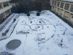 今年は「アンパンマン」から「バイキンマン」に変更したはずでしたが、雪が降り、気がついてみると「アンパンマン」が再び現れました。正義の味方「アンパンマン」は偉大ですね。子ども達も、この絵に負けないくらい、雪まみれになって中庭で遊んでいます。たくましさをアンパンマンからもらっているのかもしれませんね。
