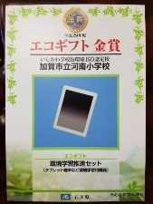 12月26日(火)石川県庁19階において、「エコギフト贈呈式」が行われ、河南小学校を代表して環境委員会の6年生川村さん、谷口さん、楠田さんの3名に、谷本知事より直接目録が渡されました。河南小学校は、これまでのエコ活動の取組が認められ、「金賞」(石川県で2番目の賞)となり、今後タブレット2台、デジタルカメラ5台が贈呈される予定です。運動会での「エコ分別競争」や「節水、ごみゼロ運動、校内美化」などが高く評価されました。これからも、小さな取組ではありますが、地球環境保全のために継続していきたいと考えています。