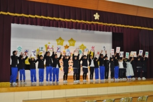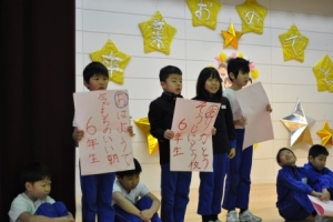 3月1日(木)に「卒業生を送る会」が行われました。1年生から5年生までが、歌や劇、ゲームや物まねなど、工夫を凝らした楽しい出し物を発表しました。先生からも、スピッツの「楓」を歌って贈りました。卒業生は、6年間の思い出を、楽しい劇にして紹介してくれました。