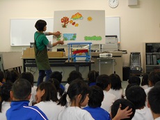 11月5日、図書委員による図書まつりがスタートしました。初日の昼休みに、新生保育園の向畦地先生によるペープサートと読み聞かせがありました。たくさんの児童が参加し、絵本の世界を楽しむことができました。