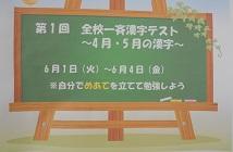 今年度も,中学校の定期テストに合わせて,家庭学習チャレンジ週間をもうけ、特に今年は、自分で自分に合っためあてを立てて勉強することに挑戦してもらっています。チャレンジ週間の後には、第1回 全校一斉漢字テストがあります。まだ覚えていない漢字、間違えやすい漢字を中心に勉強するのもいいですね。丁寧な字で書くことを目指して、勉強するのもいいですね。漢字がバッチリ書ける人は、次の課題を見つけて取り組むといいですね。自分で考えて勉強する・・・なかなか難しいですが、ぜひつけていきたい力です。頑張っている子どもたちへ、温かい励ましの言葉をお願いします。