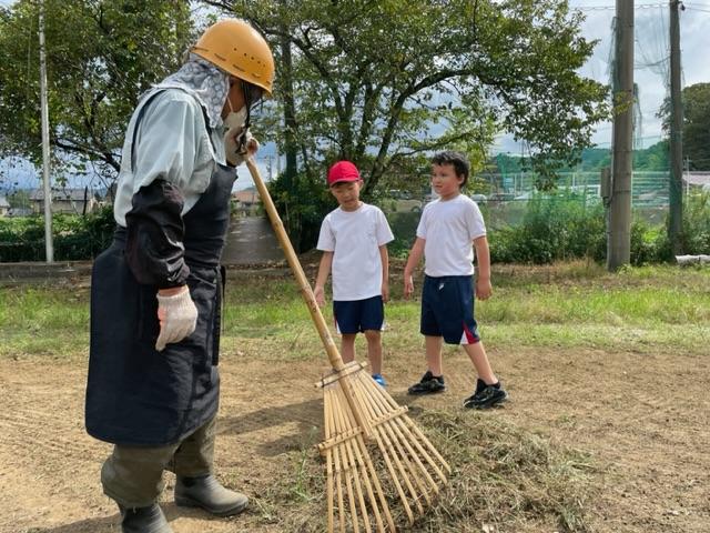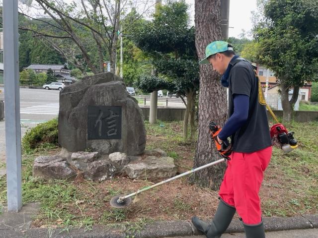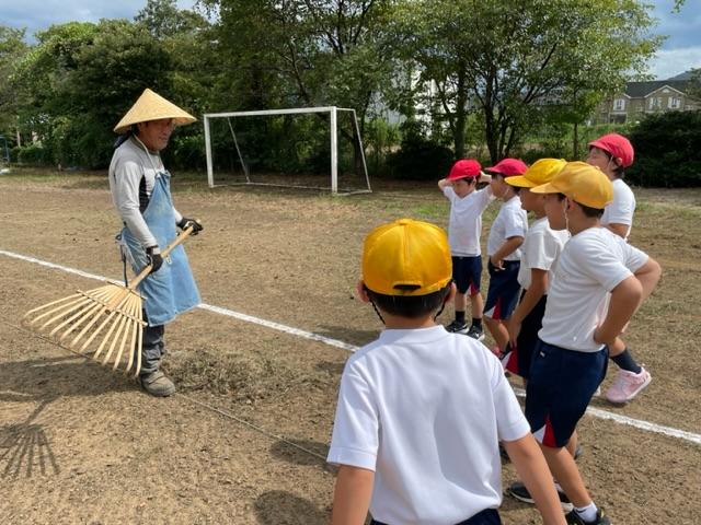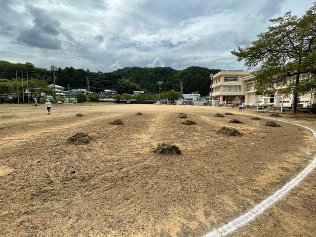 「運動場の草刈りをしに来ました」と来校者。運動場はキレイだったので、学校の前をキレイに草刈りをしてくださいました。