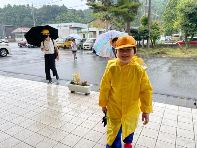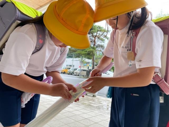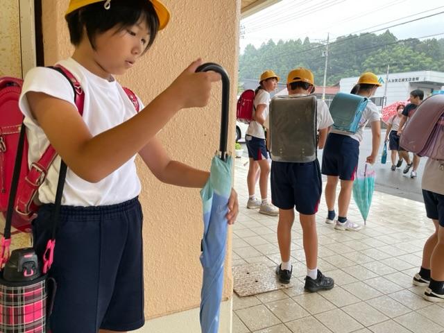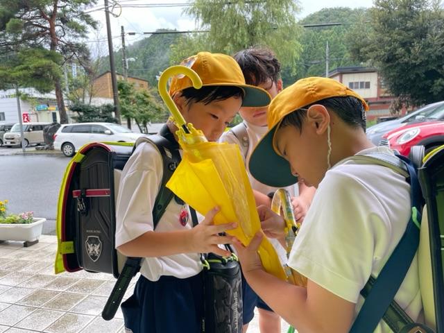 今日も昨日に引き続き雨模様_( _ ´⚰︎` )_しかし、低学年がお兄さんお姉さんのマネをして傘を丸めていました。