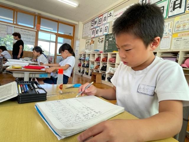 河南小学校では、毎時間どの学年でも、授業で大切なことをまとめる活動を行っています。課題に対する答えを考えながら授業を受けています。