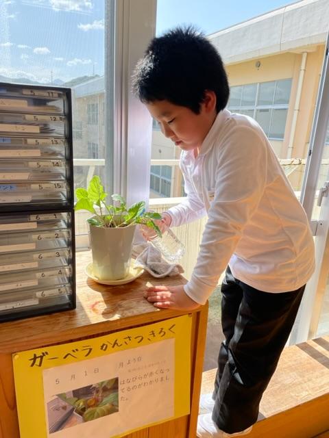 教室にあるお花に水をあげていました。「何というお花?」と聞くと、「ガーベラ。」と教えてくれました。