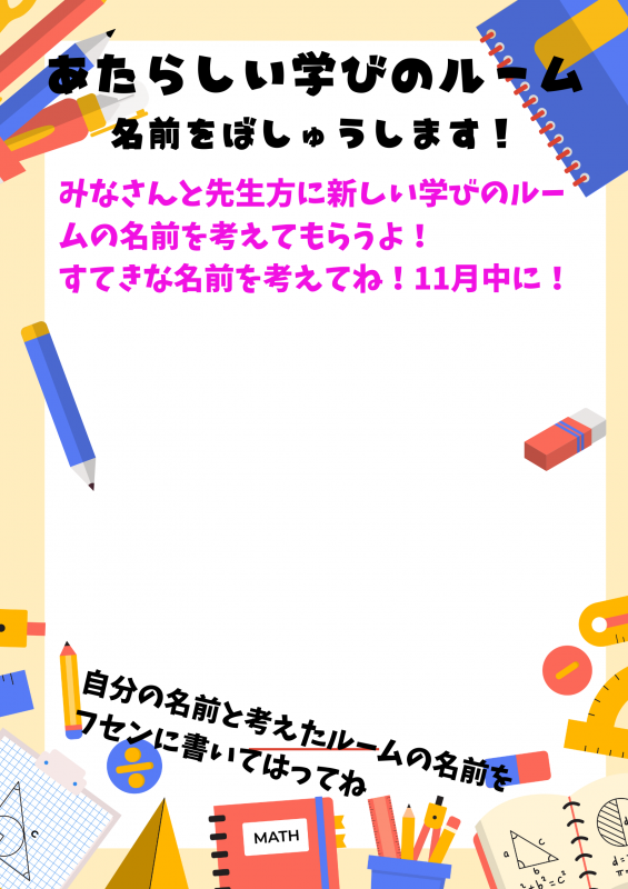 学びのルームの名前をどうしようか…そうだ!みんなに考えてもらおう!ということで募集中です!どんな名前になるかわくわくしています。早くオープンできるようがんばります!