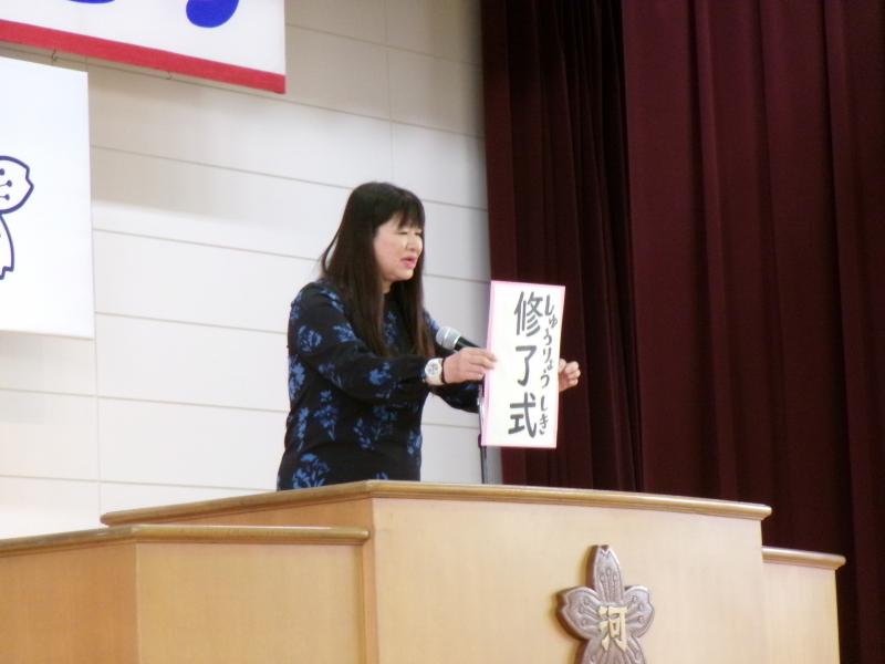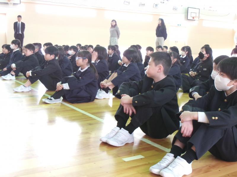修了式では「できたこともできなかったことも、うまくいったこともうまくいかなかったことも、すべてがこの1年の皆さんの成長です。新しい学年でも、できたこと・うまくいったことは続けていきましょう。そして、できなかったこと、うまくいかなかったことは、楽しみながら挑戦し続けていきましょう。…春休みの間、じっくり気持ちと体のパワーをためておいてくださいね。4月8日の新学期に笑顔で会いましょう。」ということを話しました。